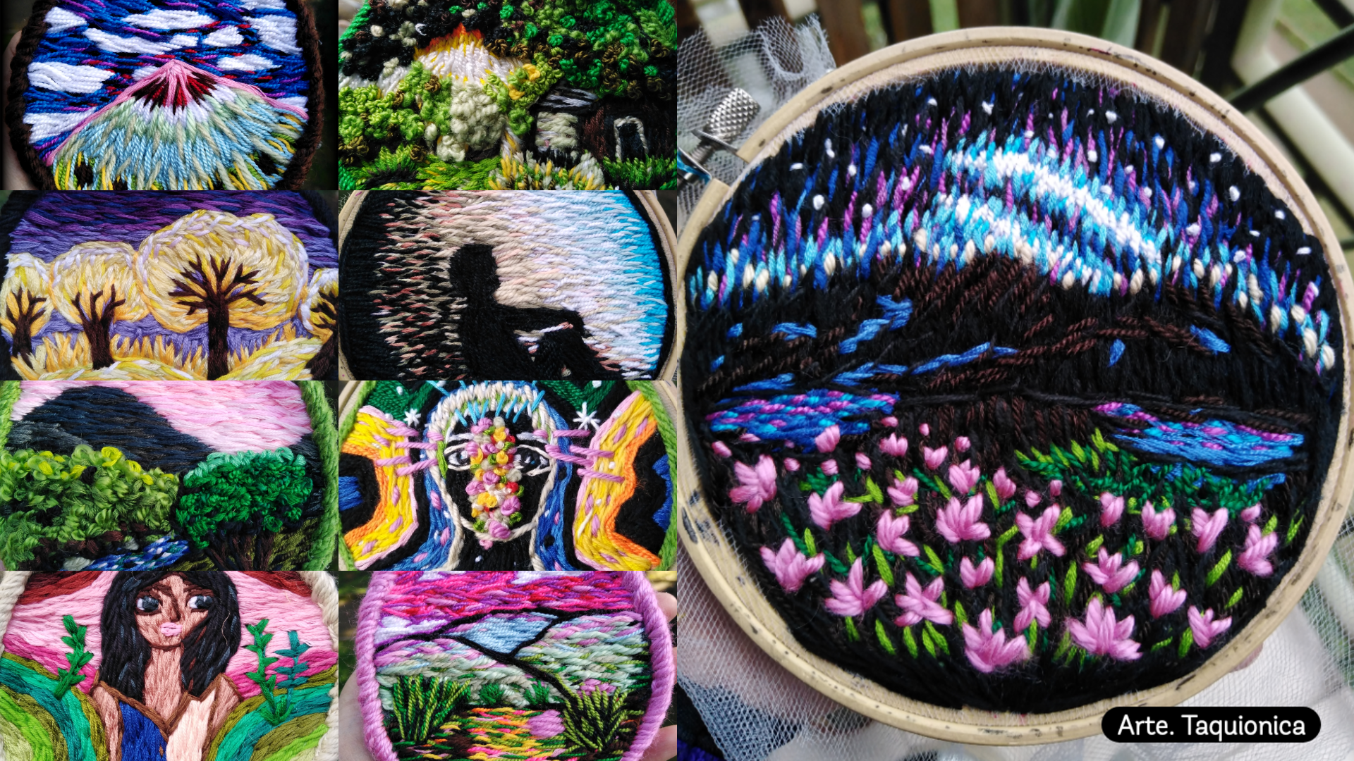 Bordados de paisajes, animales, mujeres, texturas hechos a mano, estilo muy libre, expresivo, impresionista y también usando técnica micro crochet para dar mas efecto de volumen.